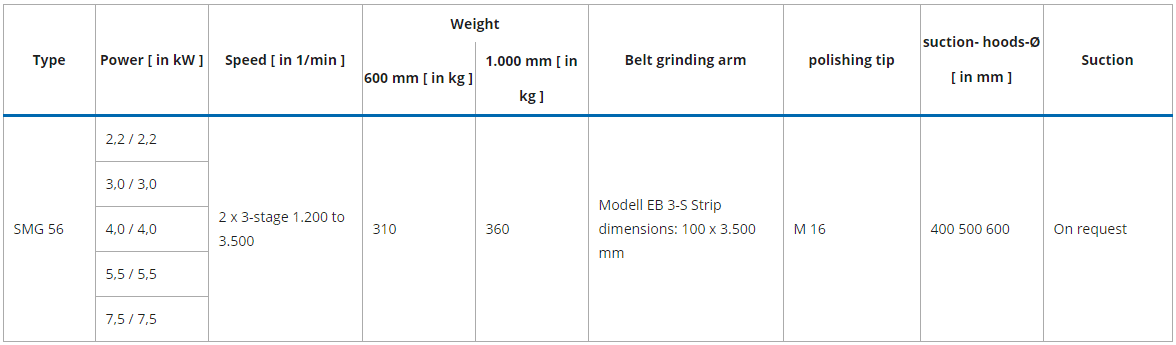 | Type | Power [ in kW ] | Speed [ in 1/min ] | Weight | Belt grinding arm | polishing tip | suction- hoods-Ø [ in mm ] | Suction | |