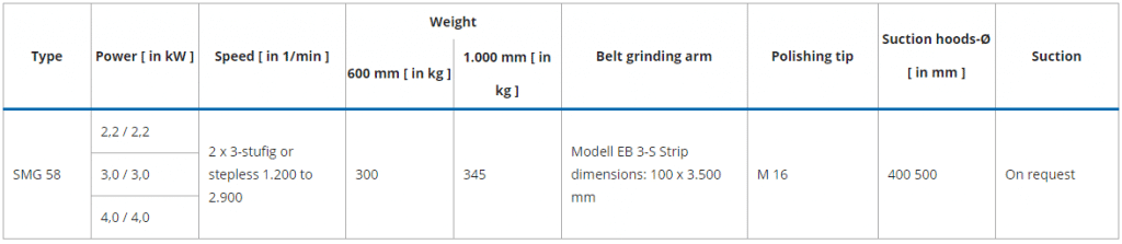 The belt grinding and polishing machines of the SMG 58 series are versatile with their different motor outputs. The SMG 58 series is a universal machine for industrial use due to its double-sided design with optional combination of belt grinding and polishing, belt grinding only or polishing only.