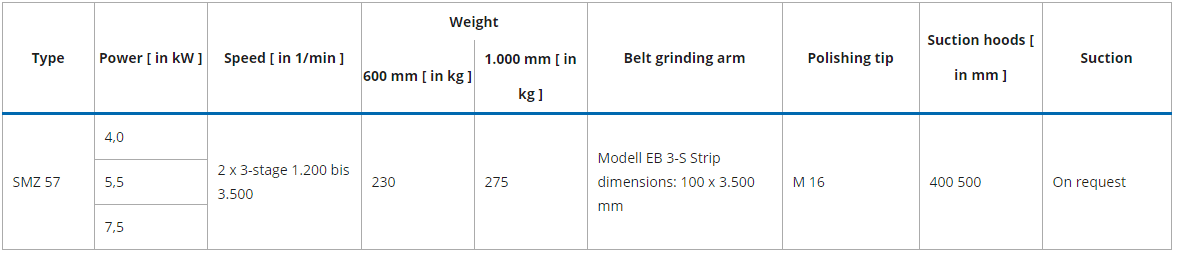 | Type | Power [ in kW ] | Speed [ in 1/min ] | Weight | Belt grinding arm | Polishing tip | Suction hoods [ in mm ] | Suction | |