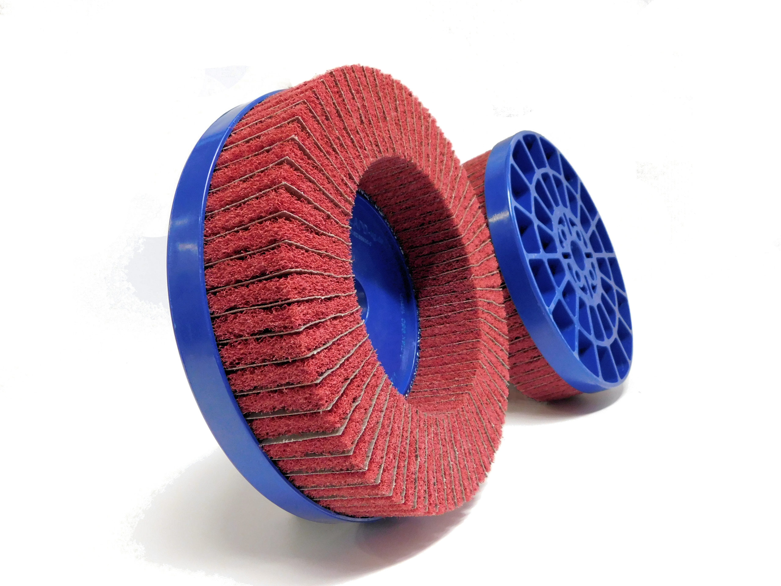 The deburring disc FAPI-250 has abrasive cloth flaps on the front which are supported by abrasive fleece flaps. Due to the special position of the flaps, deburring discs FAPI-250 can be produced individually for the respective machining process.