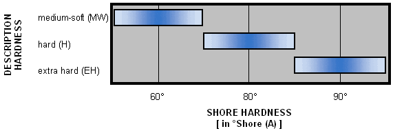 The hardness of the lamellae of foamed up Vulkollan® can be differentiated into three levels. The spectrum extends here from a medium soft lamellae of foamed up Vulkollan® with 60º Shore (A) to an extra hard lamellae of foamed up Vulkollan® with 90º Shore (A).