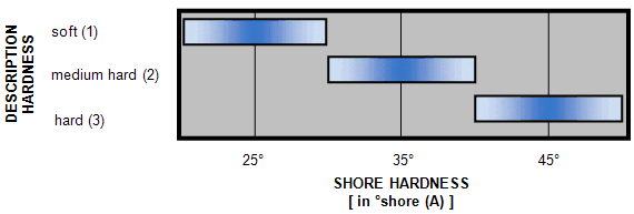 The hardness of the lamellae of foamed up Vulkollan® coating can be differentiated into three levels. The spectrum extends here from a soft coating of lamellae of foamed up Vulkollan® with 25º shore (A) to a hard coating of lamellae of foamed up Vulkollan® with 45º shore (A).