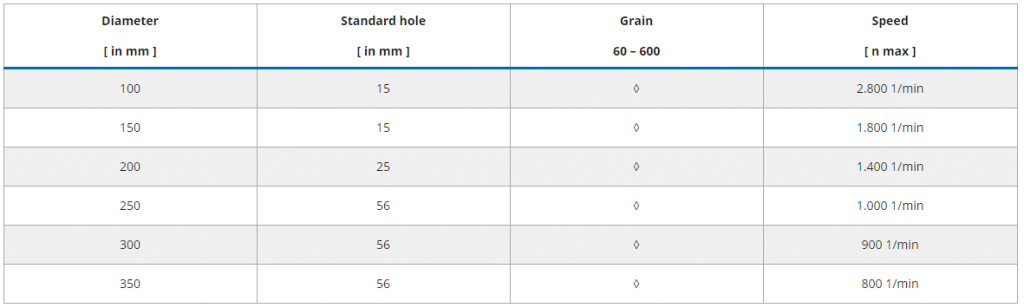 | Diameter [ in mm ] | Standard hole [ in mm ] | Grain 60 – 600 | Speed [ n max ] |