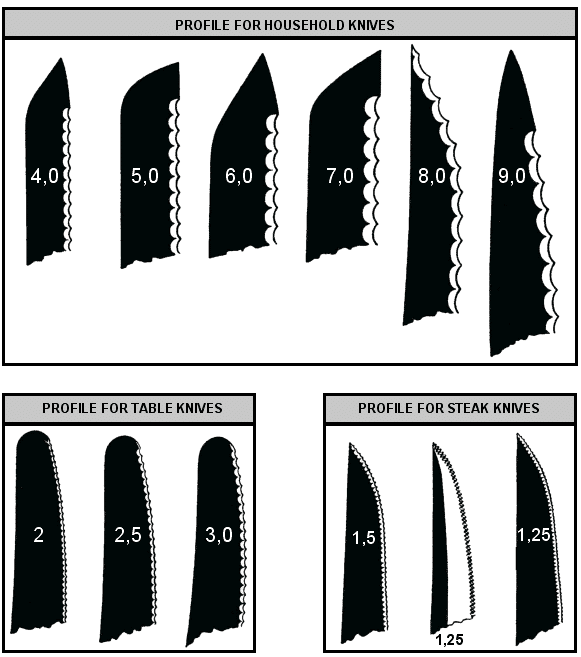 The illustrations below show profiles which, beginning at 0,25 mm, can be produced with serration grinding wheels in accordance with DBGM 1648913. A separate serration grinding wheel is needed for each profile. A corresponding wheel width is selected based on the length of the knife.