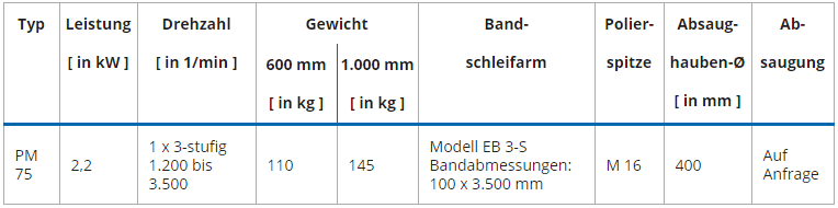 Die Bandschleif- und Poliermaschinen der Baureihe PM 75 sind mit ihrer kleinen Motorleistung kostengünstige, aber dennoch qualitativ hochwertige Einsteigermodelle. Die Baureihe PM 75 ist dabei durch ihre doppelseitige Ausführung mit wahlweiser Kombination Bandschleifen und Polieren, nur Bandschleifen oder nur Polieren eine universell einsetzbare Maschine für den industriellen Gebrauch. Drei verschiedene Drehzahlen können an der durchgehenden Welle über einen Keilriemenantrieb voreingestellt werden.