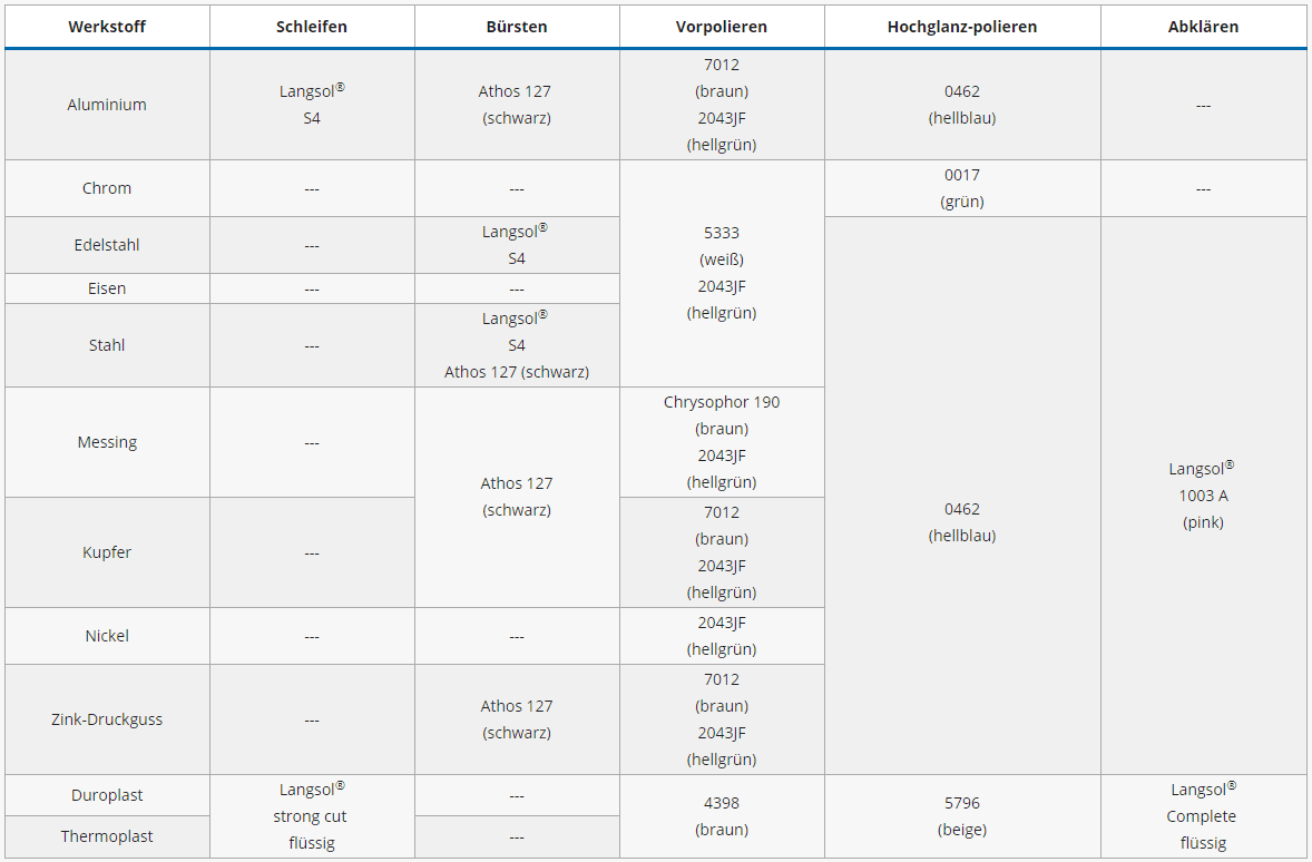 | Werkstoff | Schleifen | Bürsten | Vorpolieren | Hochglanz-polieren | Abklären |