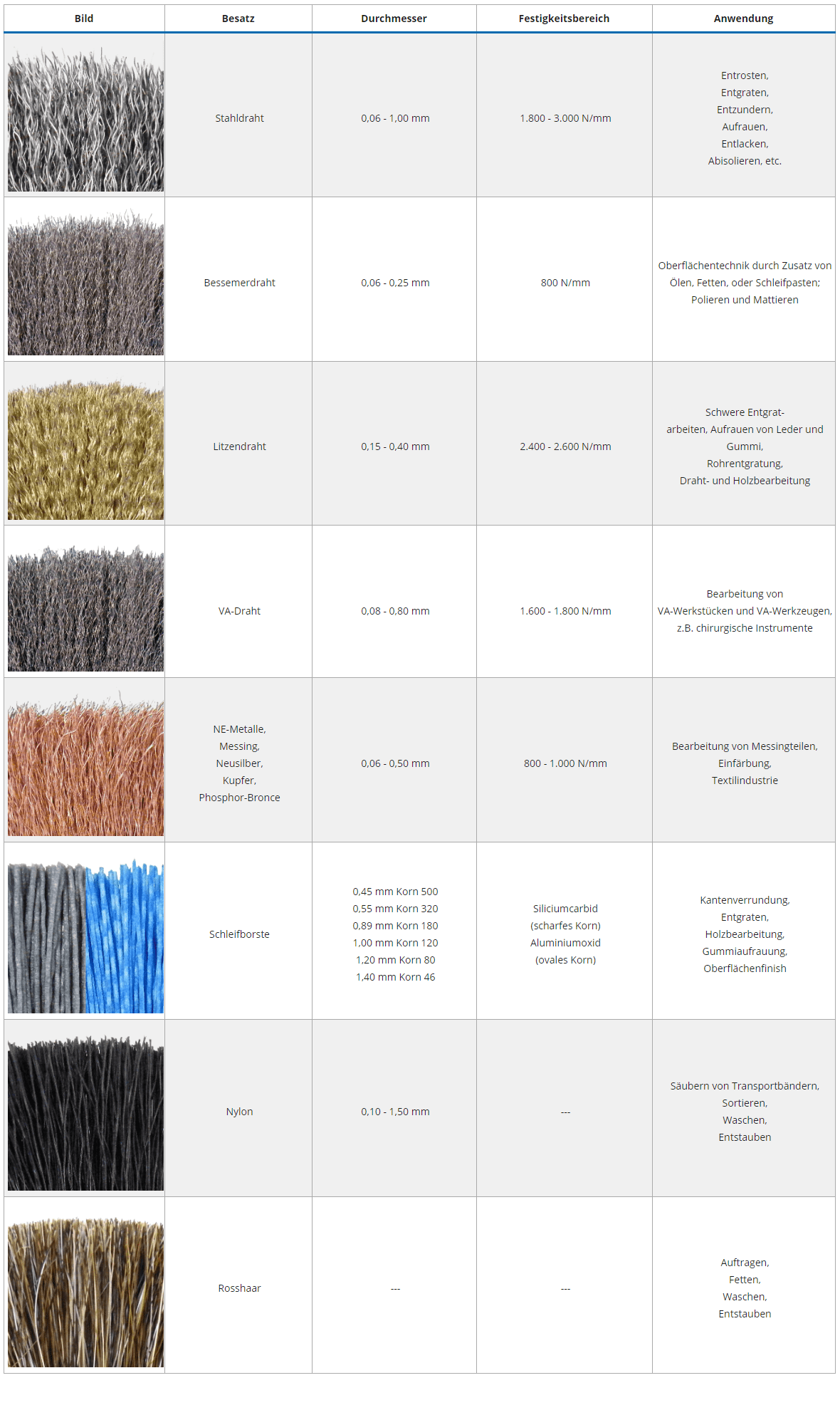 Bessemerdraht 0,06 - 0,25 mm 800 N/mm Oberflächentechnik durch Zusatz von Ölen, Fetten, oder Schleifpasten;