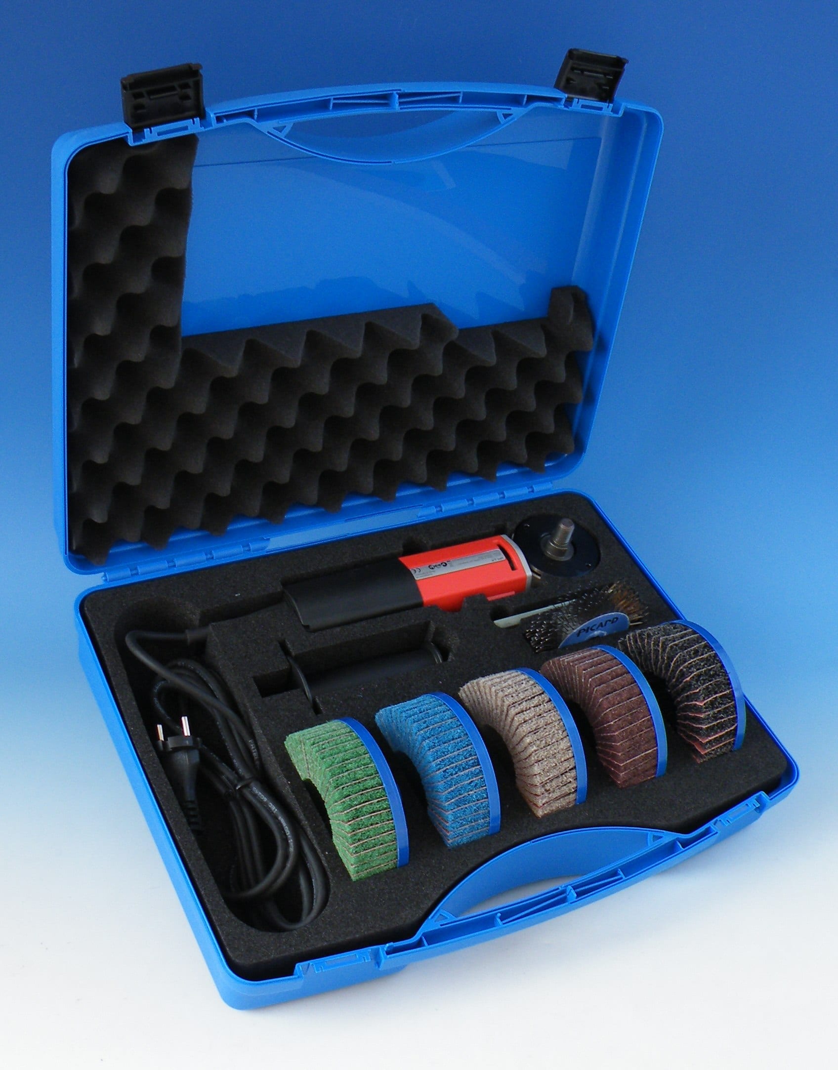 Das Entgrat-Kofferset FAPI-FIX wird in einem Hartschalenkoffer geliefert und beinhaltet einen Winkelschleifer FAPI-UPC 2R, eine Rundbürste FAPI-SCRATCH, einen Schärfstein FAPI-SHARP sowie 5 Entgratschleifteller FAPI-M14, bei denen Sie zwischen verschiedenen Schleifvliesqualität und Körnung des Schleifgewebes für Ihren Anwendungsfall frei wählen können!