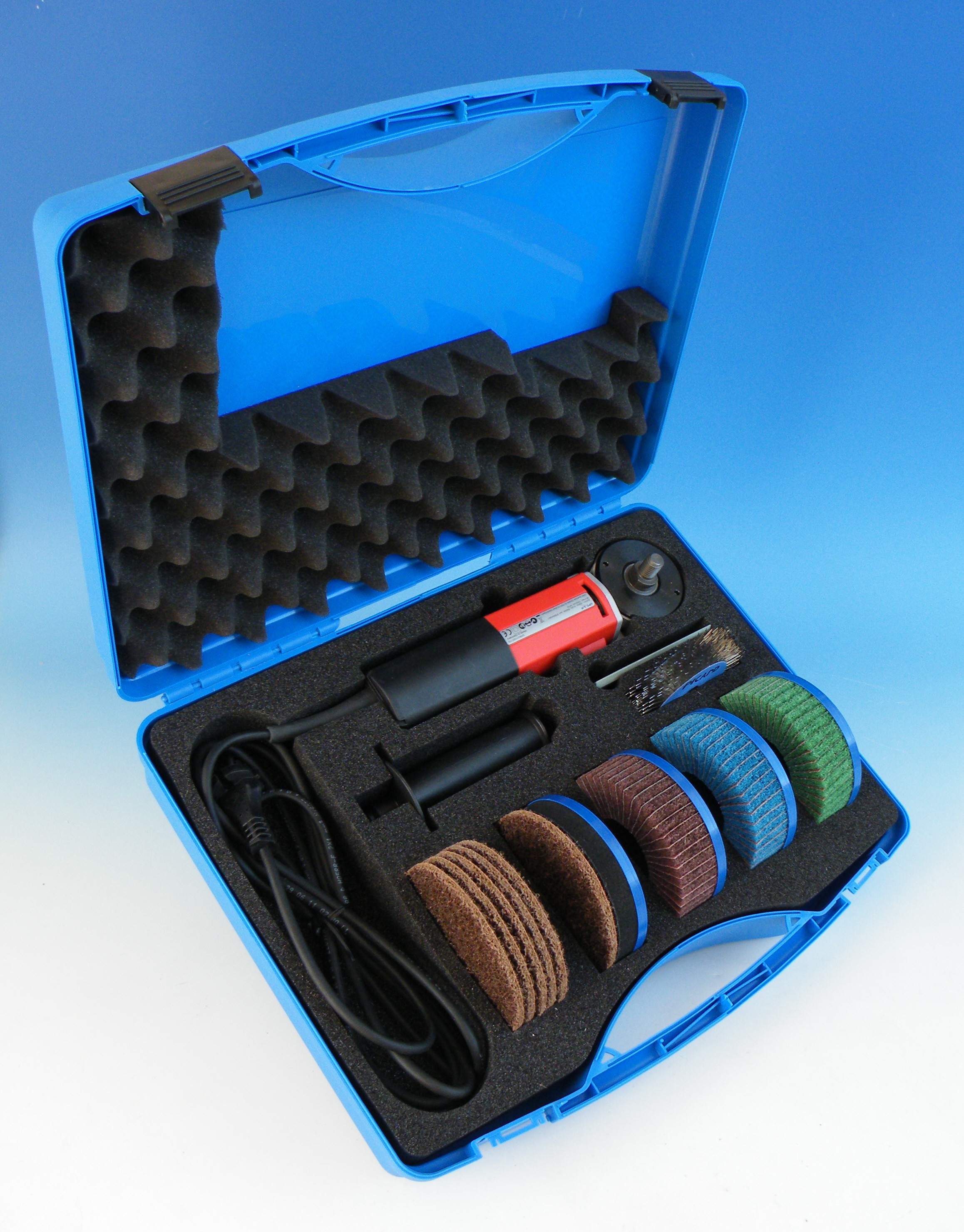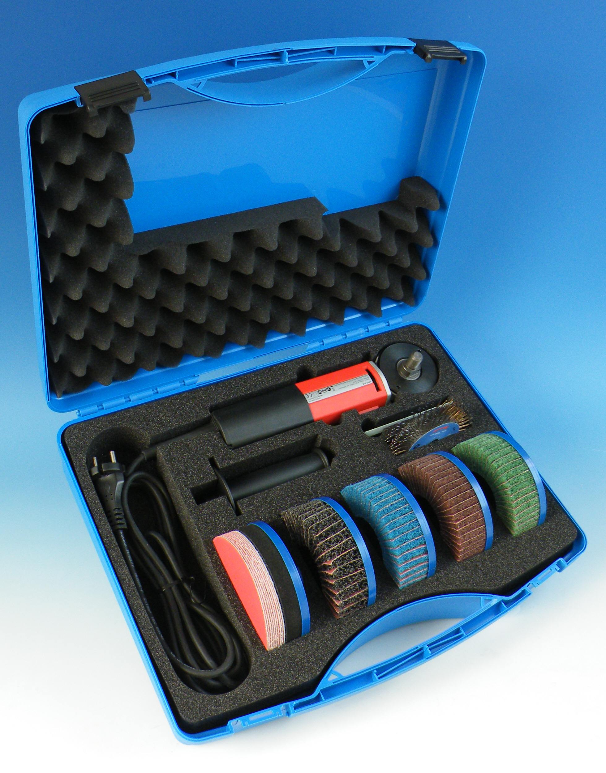 Um flexibel auf die Wünsche unserer Kunden und deren Einsatzbereiche zu reagieren, haben wir verschiedene Varianten unseres Entgrat-Koffersets FAPI-FIX zusammengestellt! Mit der Hinzunahme unseres Klettträgers FAPI-KLETT M14 besteht nun die Möglichkeit die Maschine in unserem Kofferset auch mit kletthaftenden Schleifmitteln einzusetzen. Wahlweise kann hier bei der Erstausstattung des Koffers neben 3 bzw. 4 unserer Entgratschleifteller FAPI-M14 auch zwischen kletthaftenden Schleifscheiben oder kletthaftende Schleifvliesscheiben in der gewünschten Qualität und Körnung gewählt werden. Diese Möglichkeit der variablen Zusammenstellung bietet dem Anwender volle Flexibilität bei der Auswahl der Werkzeuge für seinen Bearbeitungsprozess.