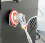Mit dem vorhandenen Vakuum werden die Werkstücke an ihrer Position gehalten. Eine direkt am Entgratschleifteller angebrachte Absaugung entfernt den anfallenden Schleifstaub. Der Exzenterschleifer, der seitlich in einer Halterung positioniert ist, bietet die Möglichkeit besonders starke Grate vorab mit einer kletthaftenden Schleifscheibe zu bearbeiten.