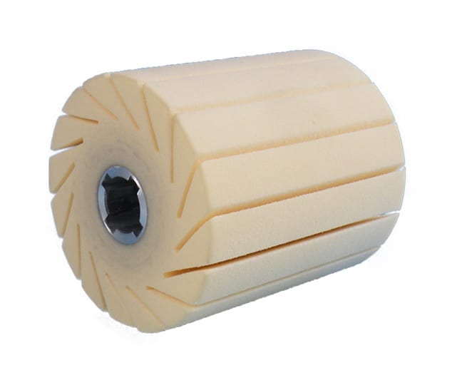 Die Expanderwalzen sind dabei ausschließlich mit einem speziell gerillten Belag aus aufgeschäumtem Vulkollan® versehen, wodurch die Schleifhülse während des Bearbeitungsprozesses, durch die Fliehkraft gespannt wird. Die mit aufgeschäumtem Vulkollan® (VU) belegten Expanderwalzen werden in der Praxis auch oft vereinfacht „Expanderwalzen mit Schaum“ oder auch Schleifhülsenträger genannt.