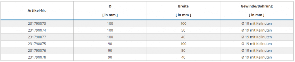 | Artikel-Nr. | Ø [ in mm ] | Breite [ in mm ] | Gewinde/Bohrung [ in mm ] |