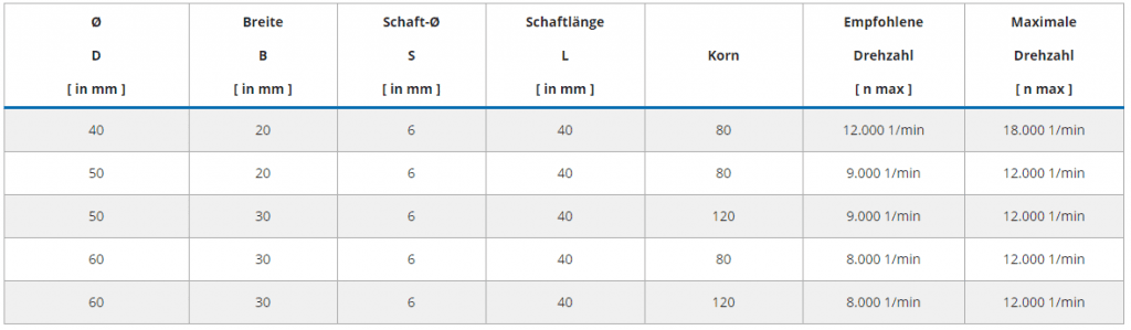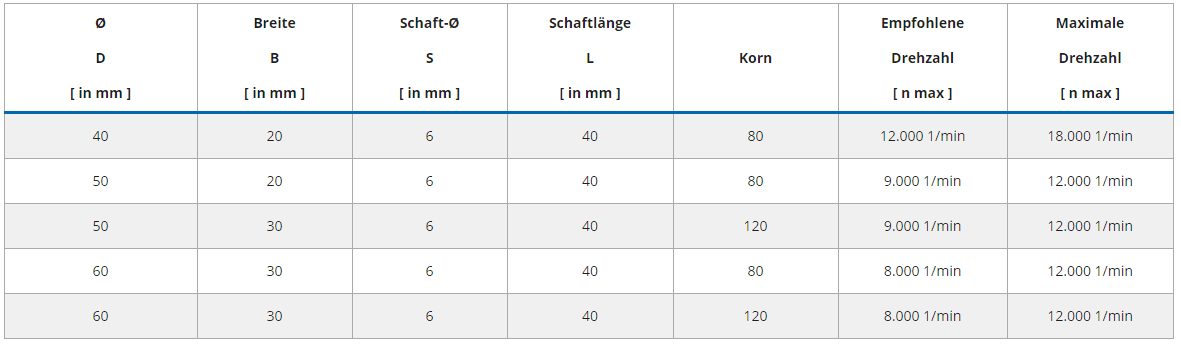 | Ø D [ in mm ] | Breite B [ in mm ] | Schaft-Ø S [ in mm ] | Schaftlänge L [ in mm ] | Korn | Empfohlene Drehzahl [ n max ] | Maximale Drehzahl [ n max ] |
