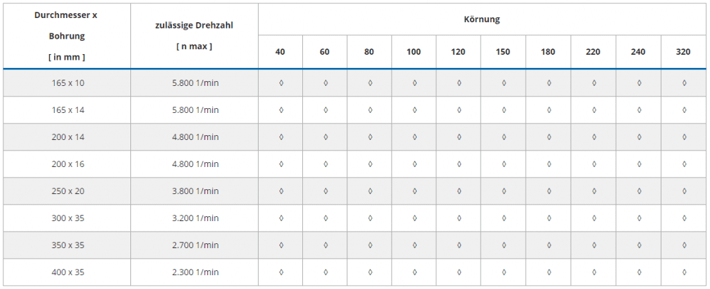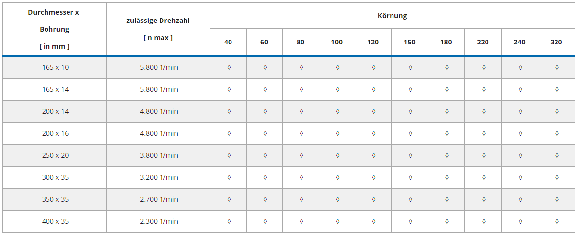 | Durchmesser x Bohrung [ in mm ] | zulässige Drehzahl [ n max ] | Körnung | |||||||||