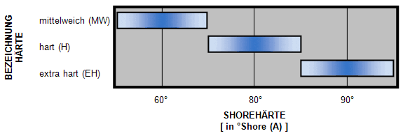 Die Härte der Lamellen aus Vulkollan® lässt sich in drei Stufen unterscheiden. Das Spektrum reicht hier von einer mittelweichen Lamelle aus Vulkollan® mit 60º Shore (A) bis hin zu einer extra harten Lamellen aus Vulkollan® mit 90º Shore (A).