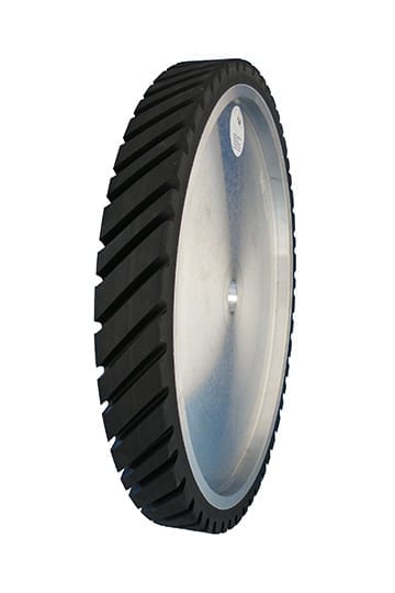 Die Kontaktscheibe FAPI–PA GEFRÄST FREQUENZGEDÄMPFT ist die Weiterentwicklung der gefrästen Ausführung. Dabei werden in den NBR-Belag der Kontaktscheibe Nuten mit einem von uns speziell entwickelten Nutbreite-Nuttiefe-Stegbreite-Verhältnis gefräst. Dadurch wird – während des Bandschleifprozesses – sowohl der Schallpegel auf ein Minimum reduziert, als auch der Abtragsleistung auf ein Maximum erhöht.