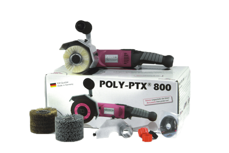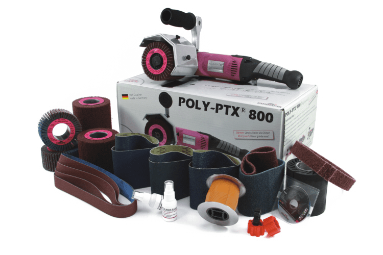 Das Längsschleifsystem POLY-PTX® 800, der Alleskönner mit dem cleveren Schleifsystem, schleift vom Gröbsten bis zum Feinsten, satiniert und poliert bis zum Spiegelhochglanz und veredelt Oberflächen von Edelstahl, Stahl, Buntmetallen wie Messing, Kupfer, Aluminium und auch Holz.