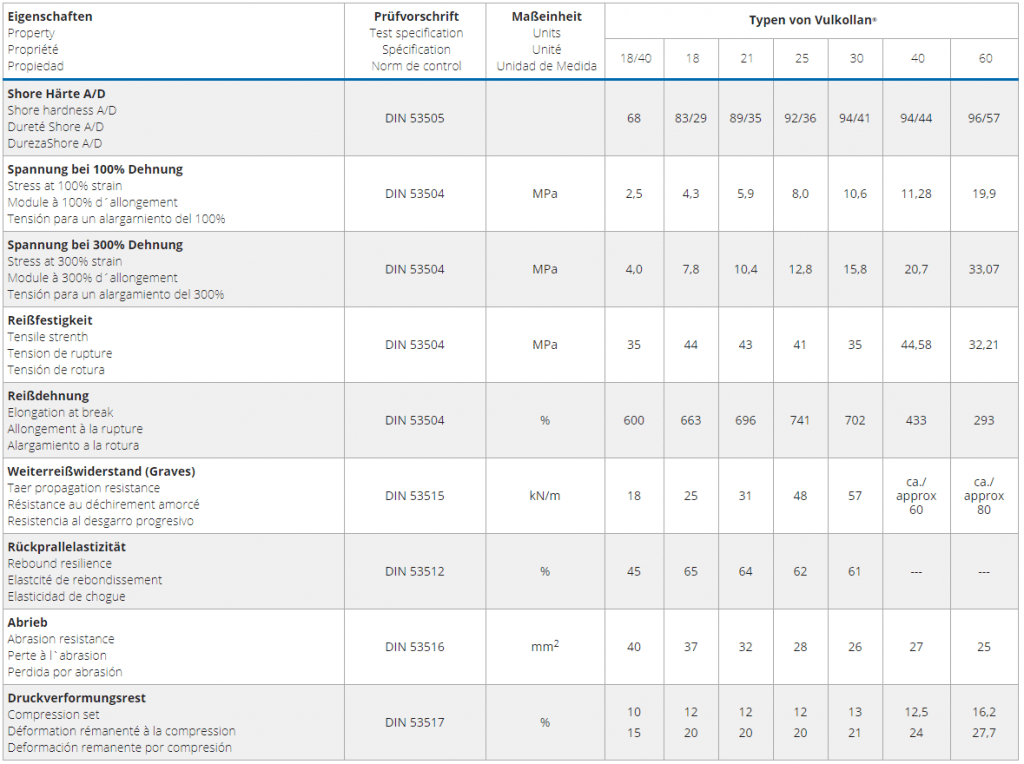 | Eigenschaften Property Propriété Propiedad | Prüfvorschrift Test specification Spécification Norm de control | Maßeinheit Units Unité Unidad de Medida | Typen von Vulkollan® | ||||||