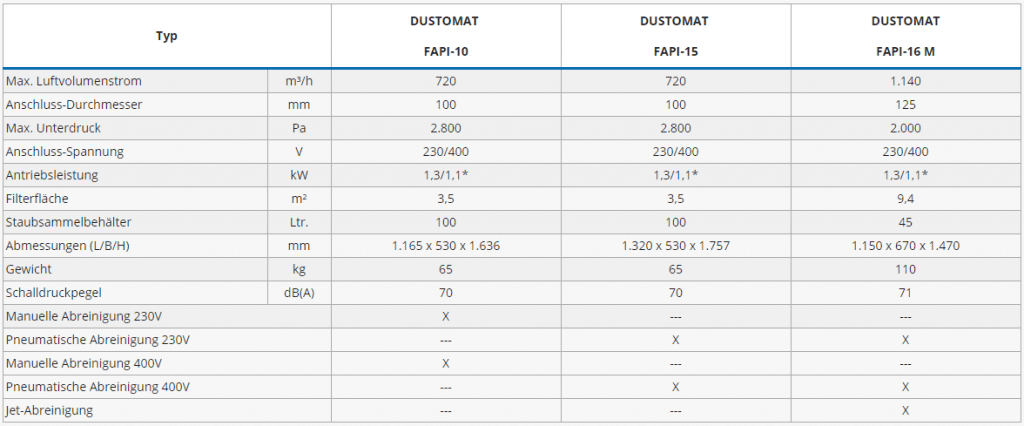 | Typ | DUSTOMAT FAPI-10 | DUSTOMAT FAPI-15 | DUSTOMAT FAPI-16 M | |