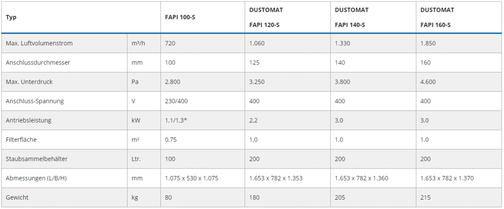 | Typ | FAPI 100-S | DUSTOMAT FAPI 120-S | DUSTOMAT FAPI 140-S | DUSTOMAT FAPI 160-S | |