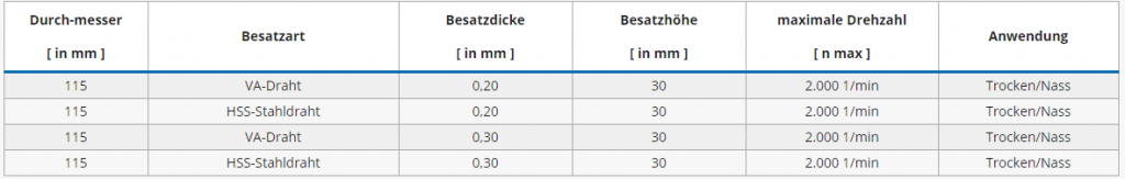 | 115 | VA-Draht | 0,30 | 30 | 2.000 1/min | Trocken/Nass |