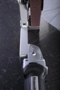 Unter der Hebelverlängerung ist ein Fuß aus schlagfestem Kunststoff angebracht. So kann die Maschine ohne Sicherheitsgefährdung abgesetzt werden, selbst wenn das Schleifband läuft – ein großes Plus an Benutzerkomfort und Arbeitssicherheit! Die Innenseite dieses Fußes ist mit einem abriebfesten, schnell wechselbaren Plättchen aus gehärtetem Edelstahl geschützt.