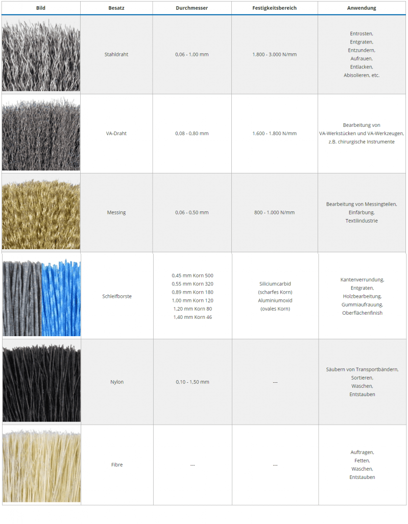 Stahldraht | 0,06 - 1,00 mm | 1.800 - 3.000 N/mm | Entrosten, Entgraten, Entzundern, Aufrauen, Entlacken, Abisolieren, etc. |