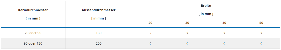 | Kerndurchmesser [ in mm ] | Außendurchmesser [ in mm ] | Breite [ in mm ] | |||