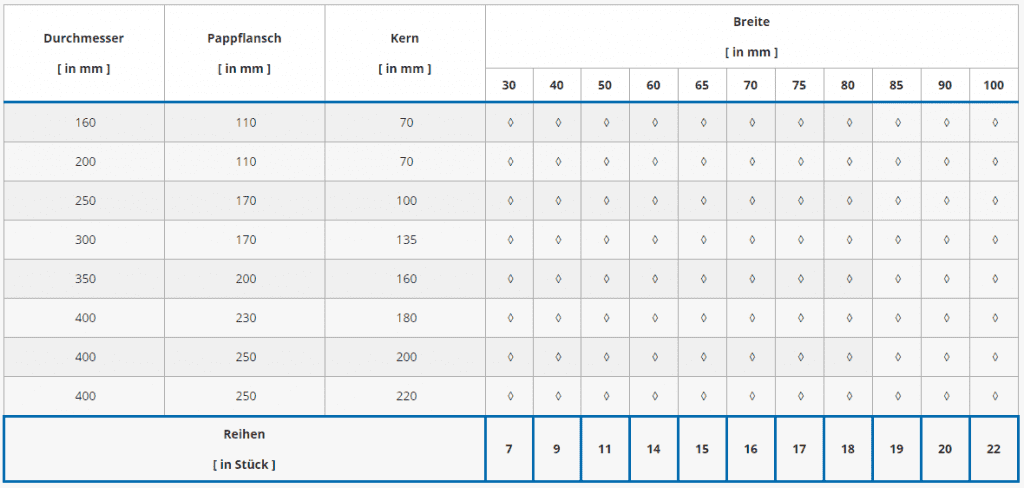| Durchmesser [ in mm ] | Pappflansch [ in mm ] | Kern [ in mm ] | Breite [ in mm ] | ||||||||||