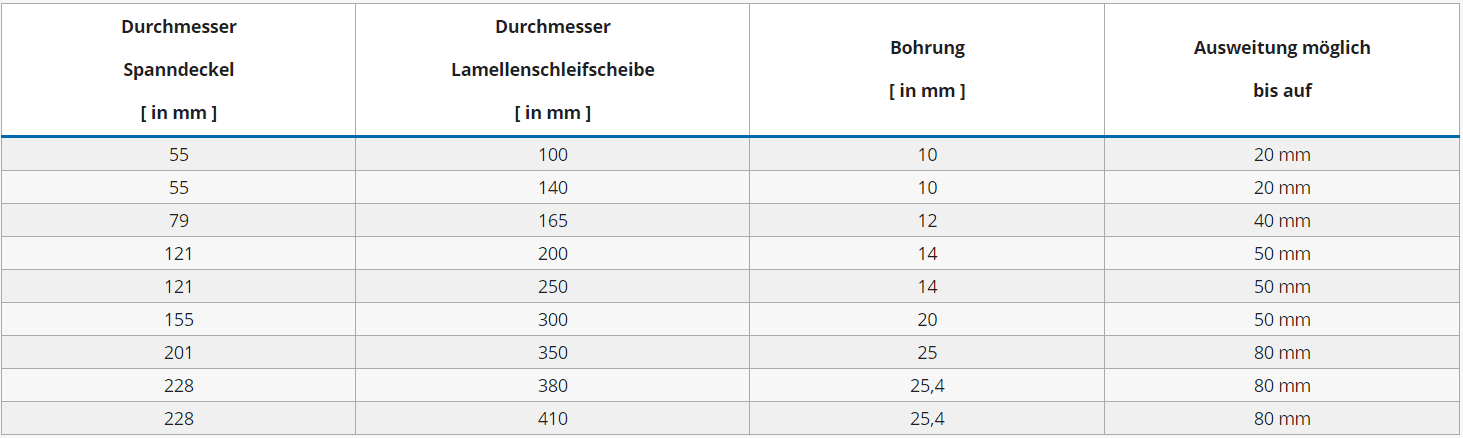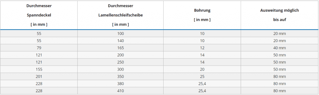 | Durchmesser Spanndeckel [ in mm ] | Durchmesser Lamellenschleifscheibe [ in mm ] | Bohrung [ in mm ] | Ausweitung möglich bis auf |