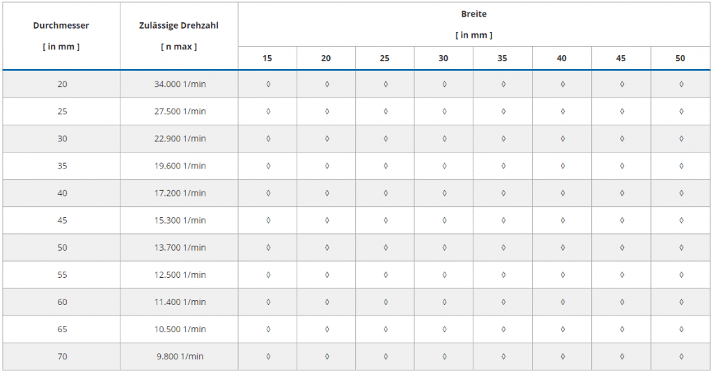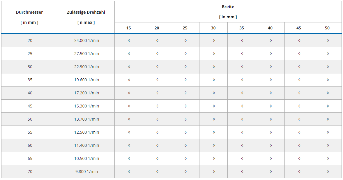| Durchmesser [ in mm ] | Zulässige Drehzahl [ n max ] | Breite [ in mm ] | ||||||||