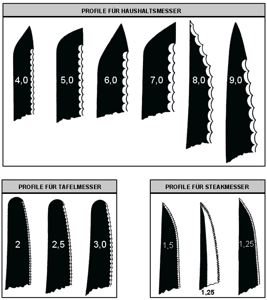 Die auf den Messerklingen verzeichneten Zahlen bedeuten die einzelnen Profilbreiten, von Spitze zu Spitze gemessen!