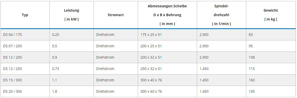 | Typ | Leistung [ in kW ] | Stromart | Abmessungen Scheibe D x B x Bohrung [ in mm ] | Spindel- drehzahl [ in 1/min ] | Gewicht [ in kg ] |
